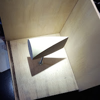 I knew that I could take a wooden dowel and in cutting it could make a shape that would cast two shadows, but the third shadow - the triangle - that would be the tough part. Little did I know how hard it would end up being. Suffice it to say that the first angular cut was easy, but making the opposite matching one not only proved difficult - it was also dangerous. Eventually I was able to make three large ones and two smaller ones, without losing any fingers or impaling any one or any thing. The "stage" I made out of plywood, and I suspended the "Subjective Object" (nicknamed "Fred") on some all thread.